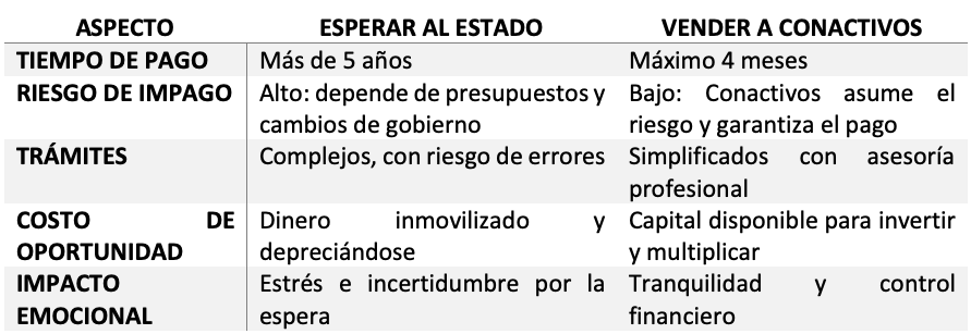 ¿Qué pasa si el Estado decide pagar después de vender? Una vez firmas la cesión con Conactivos, el derecho de cobro se transfiere a la empresa. El Estado pagará a Conactivos cuando corresponda. Tú no tendrás que preocuparte por trámites ni plazos; ya habrás recibido tu indemnización.